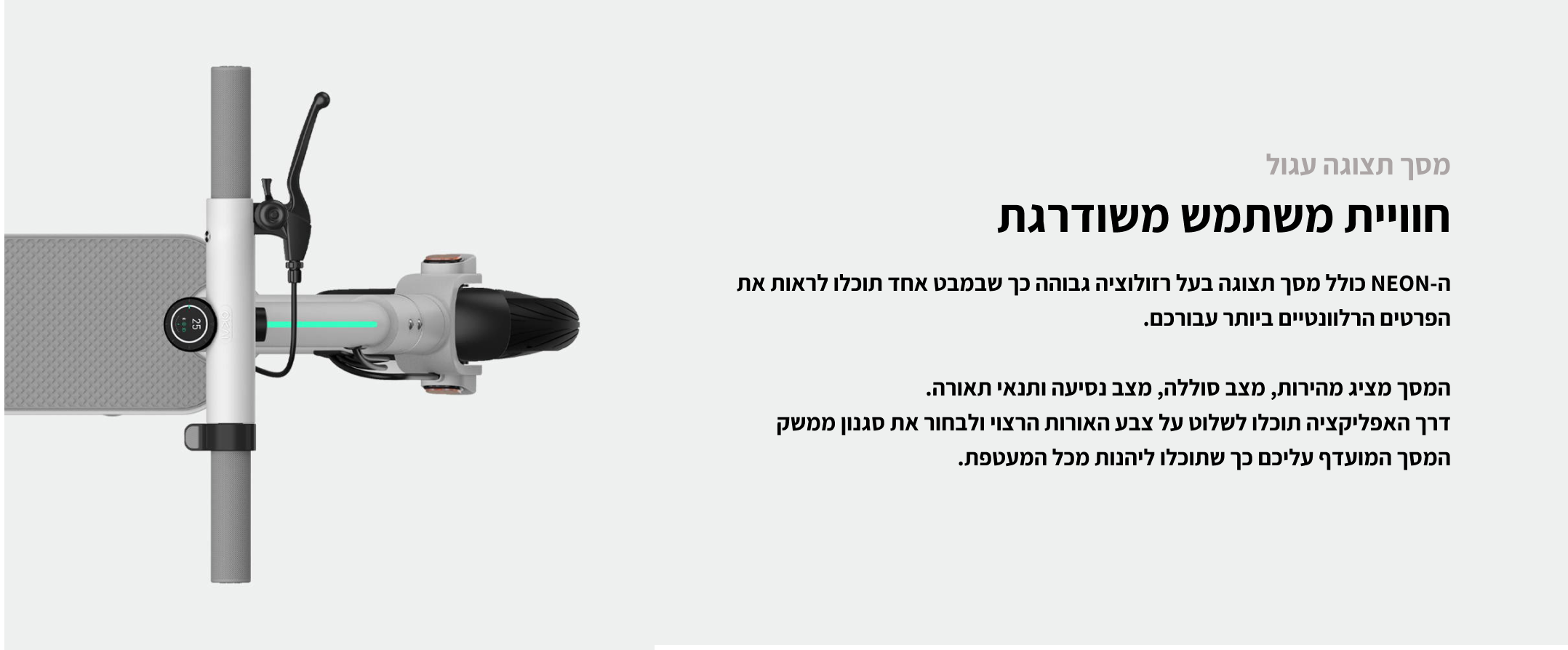 • ה-NEON כולל מסך תצוגה עגול, בראש הכידון. המסך נוח וקומפקטי ומאפשר להתעדכן בזמן אמת במצב הרכיבה, מצב הסוללה, מהירות, בלוטות' וצבע האורות